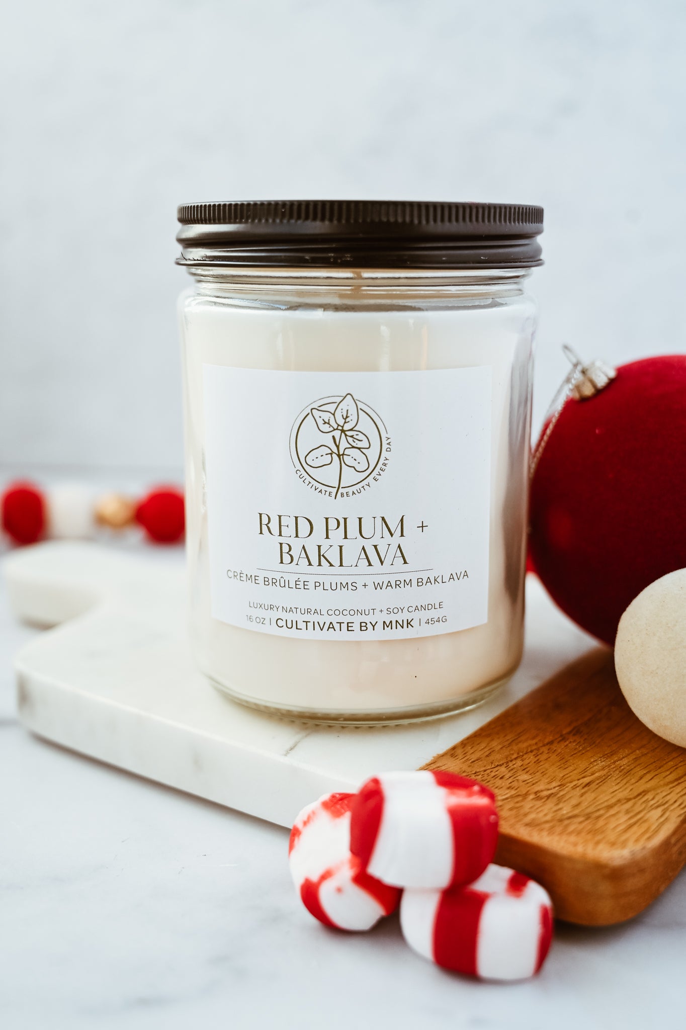 Red Plum + Baklava is a blend of brandied red plums, pears and nutty layered baklava phyllo dough.