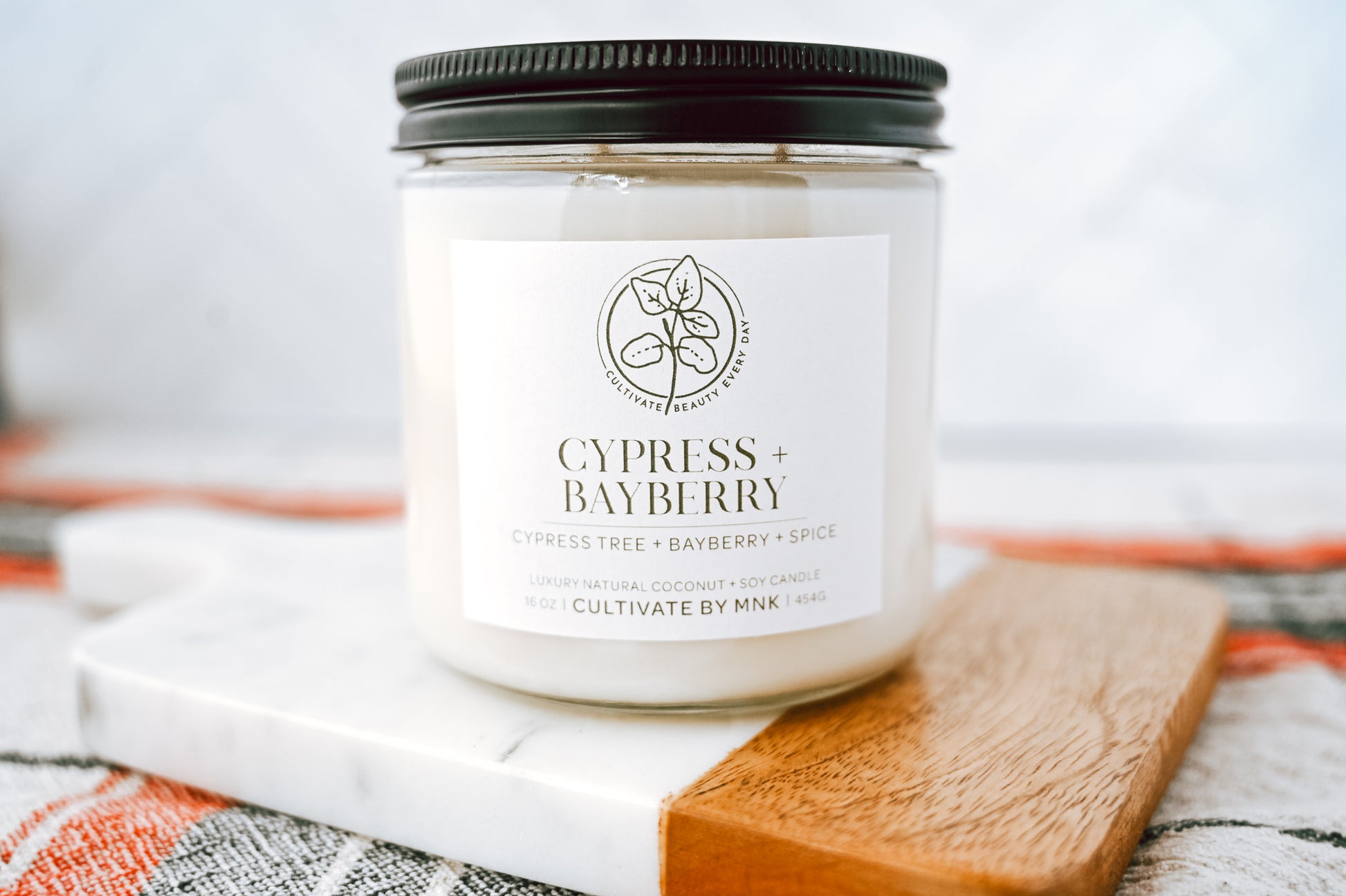 Notes of cypress, moss, and bayberry blend with rich undertones of fir, patchouli, and sweet incense. Fir, patchouli, eucalyptus, and mint essential oils intensify the fresh foliage notes. Cypress and Bayberry brings the the ambience of pristine woods into your home.
